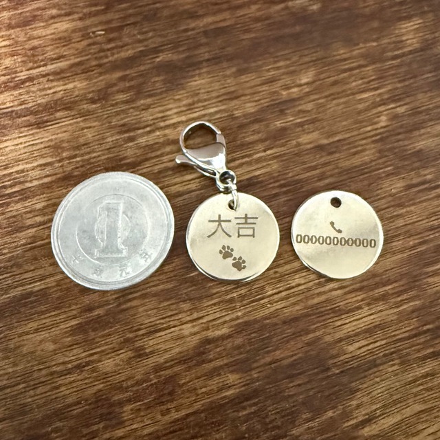 小型犬、猫ちゃん、首輪装着向きのステンレス製の迷子札です ⭕️表には名前、裏は電話番号を刻印します 【注文方法】備考欄にワンちゃん、ネコちゃんのお名前と、電話番号を入力ください。 ⚫︎お名前は、平仮名・ローマ字・漢字、入力されたとおりに刻印いたします。 【サイズ】ちょうど1円玉くらいの大きさです。 【重さ】2g 【素材】ステンレス・ナスカン/ニッケル・リングマルカン/金属 【発送について】入金確認後5日以内に、クリックポストで発送いたします。